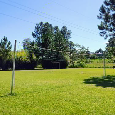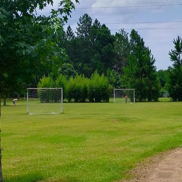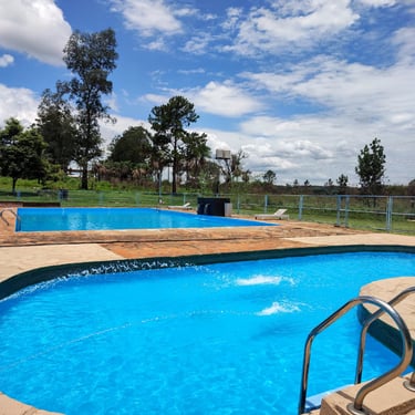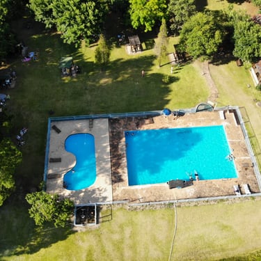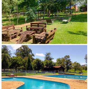 Un parque extenso con piscinas, canchas de fútbol y zona de acampe.